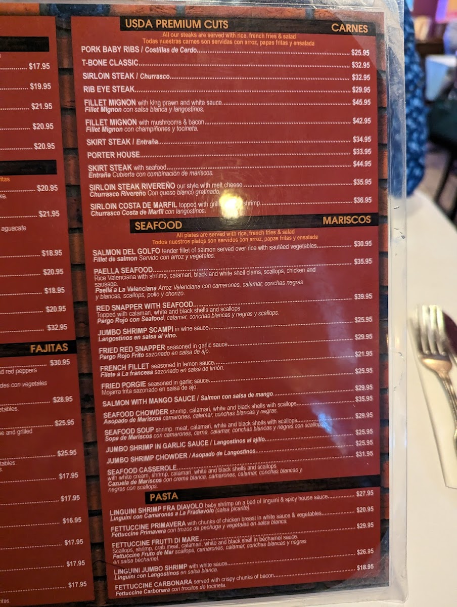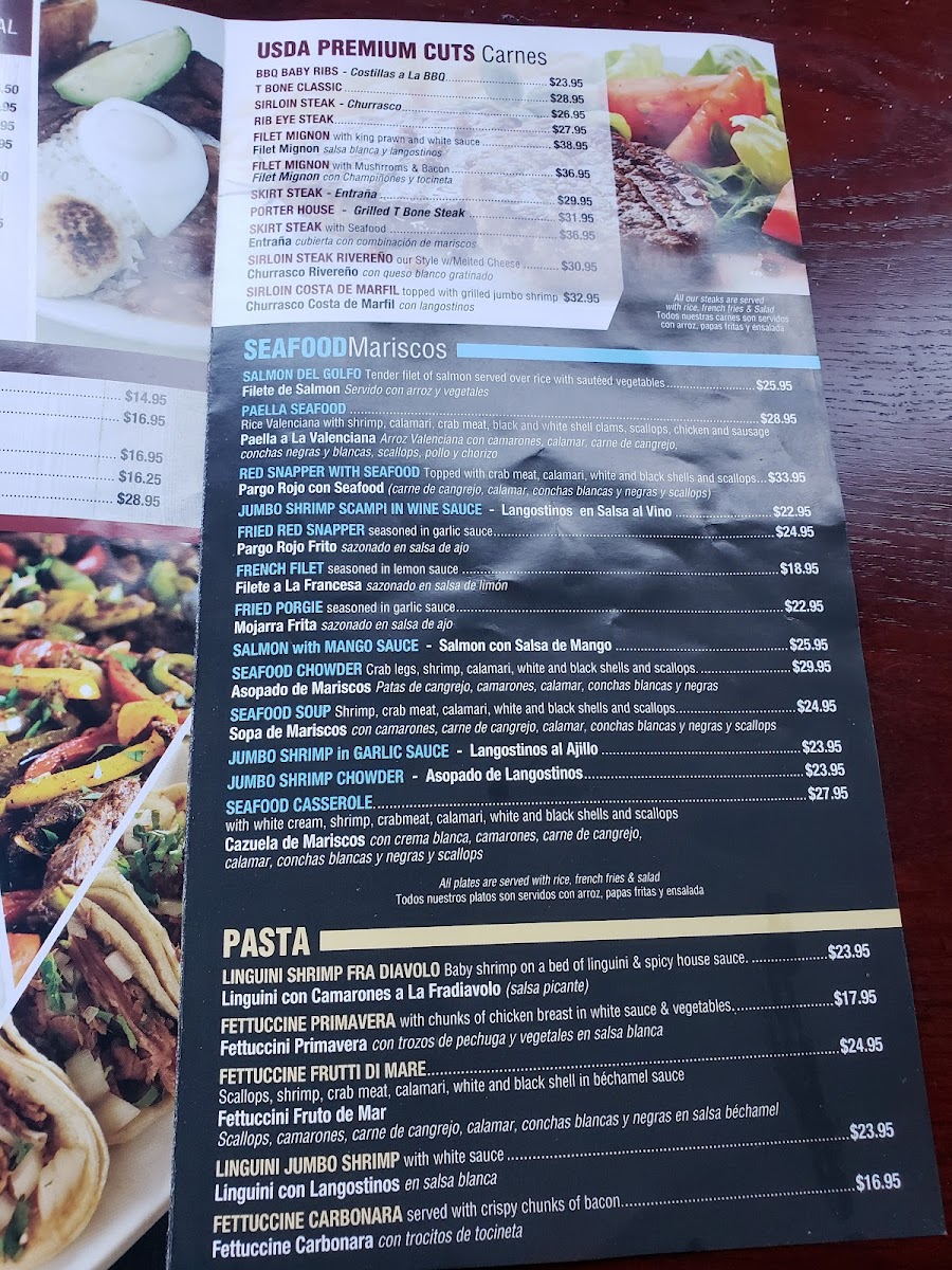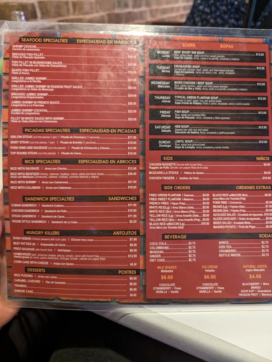 Additional offerings include appetizers like Fried Calamari, Fried Green Plantains (Tostones), Empanadas De Carne (Beef Patties), and main dishes such as Paella Marinera and Chimichangas. Desserts such as Cheesecake are also part of the menu, rounding out the dining experience.