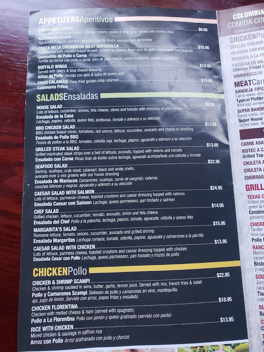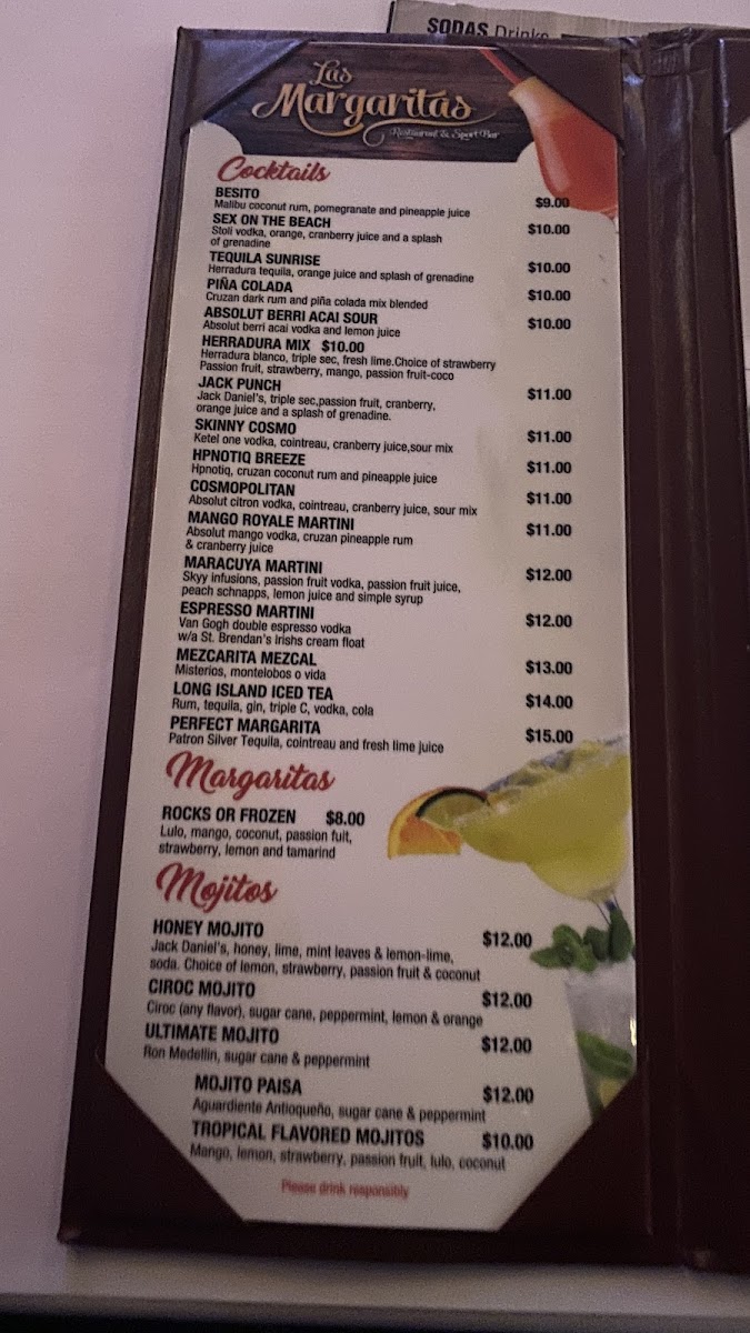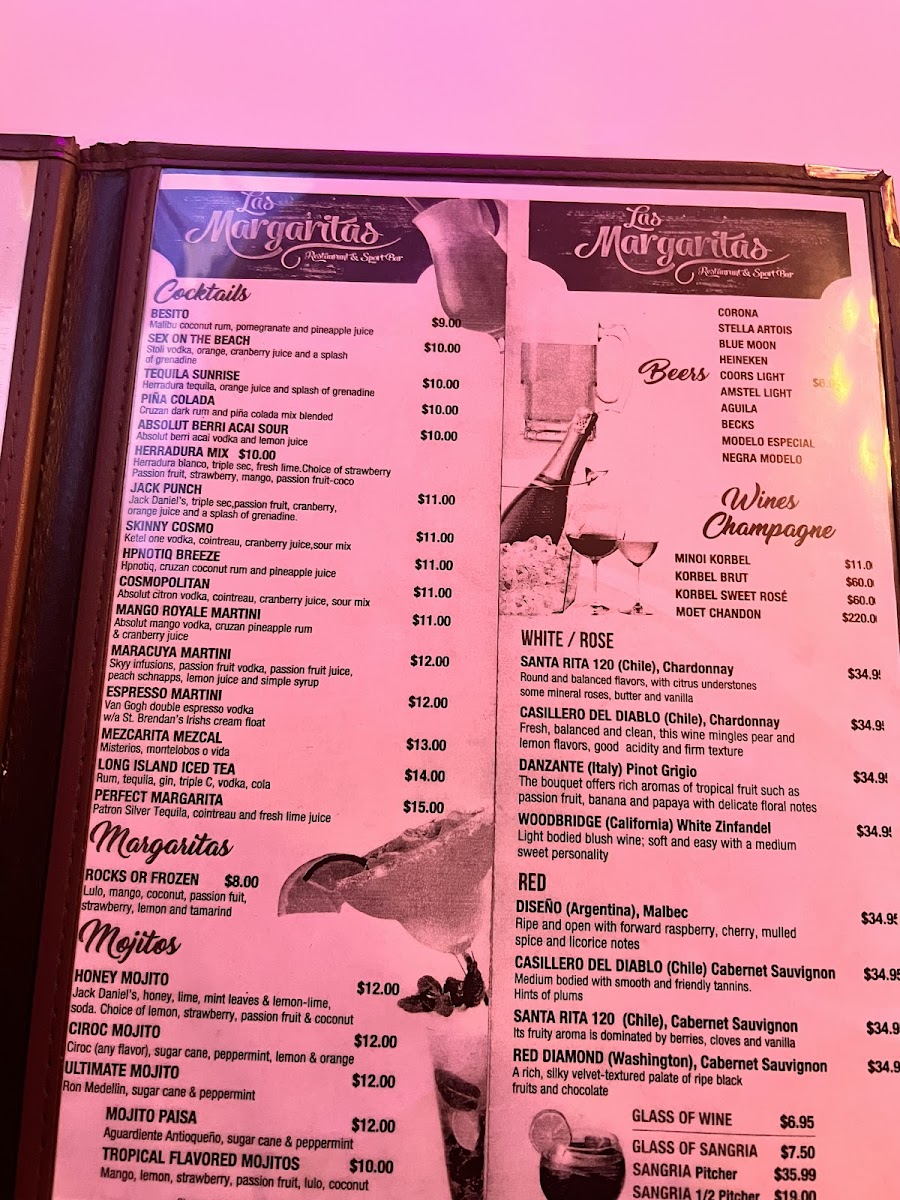 The menu at Las Margaritas - Jackson Heights features a diverse selection of Colombian and international dishes, alongside a variety of drinks typical of a restaurant and bar & grill setting. It is structured to offer a range of options suitable for casual dining and social gatherings.