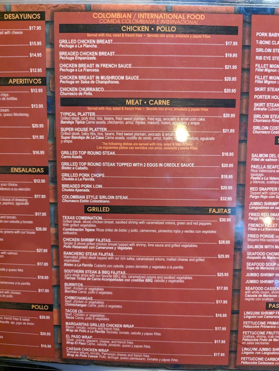 - Colombian & International Food: Offers various grilled and breaded chicken breast options, chicken in different sauces (French, mushroom), and specialties like the Typical Platter (Bandeja Tipica) and Super House Platter.